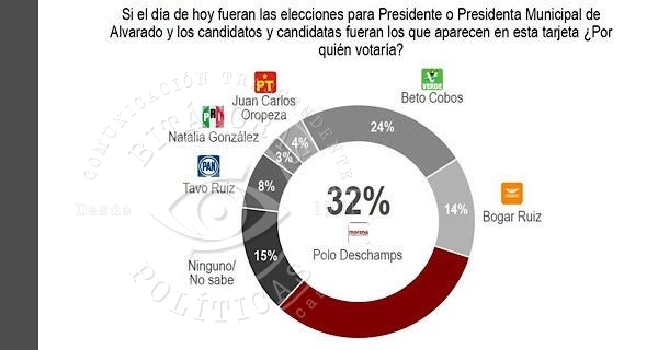 A tan solo una semana de haber iniciado oficialmente las campañas municipales, Polo Deschamps, candidato de Morena a la presidencia municipal de Alvarado, encabeza la intención del voto con una ventaja de casi 10 puntos sobre su más cercano competidor, según revela una encuesta levantada en vivienda por la firma Covarrubias y Asociados.