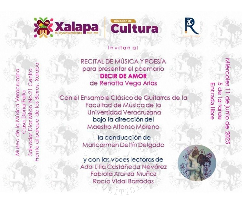 A las 18:30 horas, en el Museo de la Música Veracruzana, se tendrá el proyecto “Poesía + Ambiente”, con musicalización de Eara Ronzón y los visuales de Axel Calatayud. A las 19:00 horas, en el CRX se inaugurará la exposición pictórica “Ecos de una ciudad desnuda”.