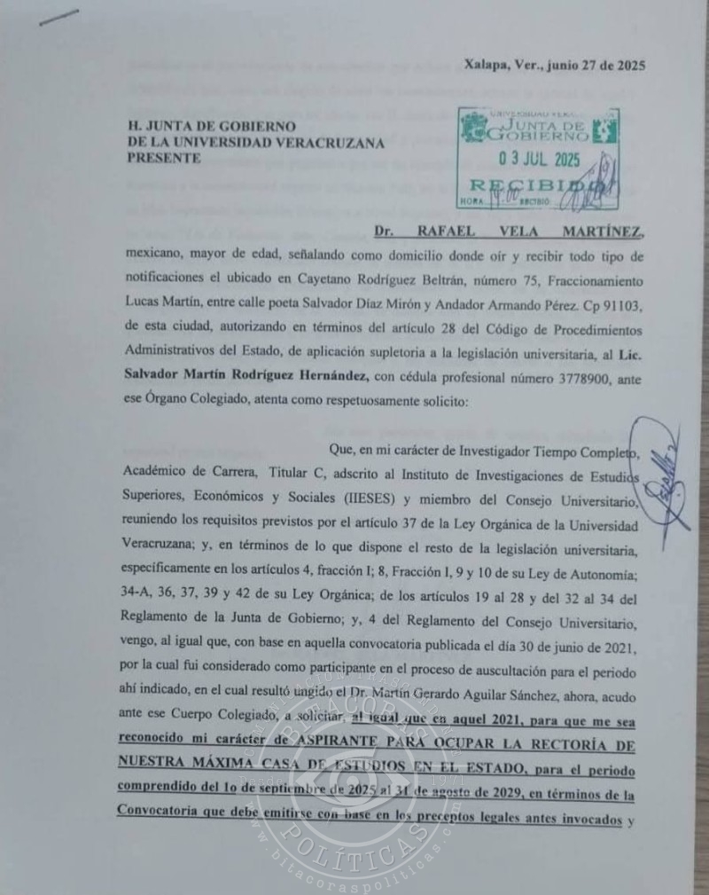 La Junta de Gobierno de la Universidad Veracruzana (UV) recibió este jueves, de manera formal, la solicitud del doctor Rafael Vela Martínez para ser considerado como aspirante a la Rectoría de la Máxima Casa de Estudios del estado, en el periodo que comprenderá del 1 de septiembre de 2025 al 31 de agosto de 2029.