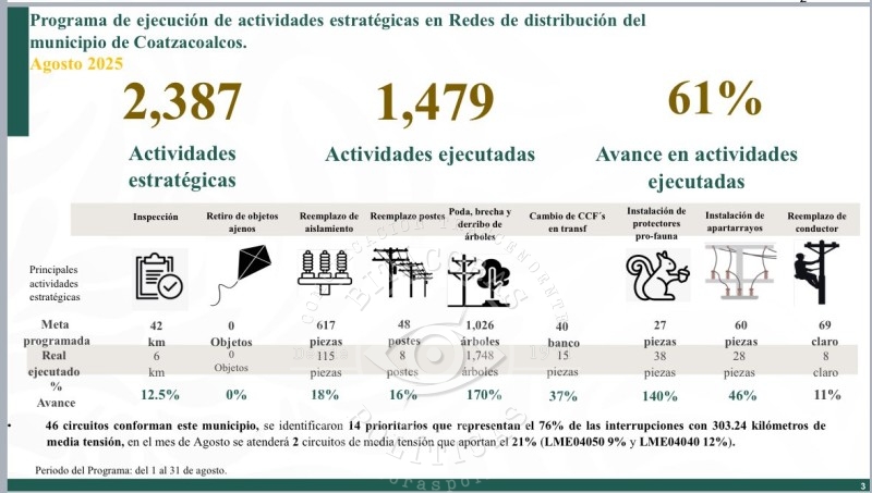 La Comisión Federal de Electricidad (CFE) Distribución, en coordinación con el alcalde electo de Coatzacoalcos, Pedro Miguel Rosaldo García, puso en marcha un plan de actualización de la red eléctrica que inició en agosto y concluirá en diciembre de este año. La estrategia consiste en invertir el orden de mantenimiento: ahora se atenderá primero al centro de la ciudad y después a los ejidos, con el propósito de beneficiar con mayor rapidez a la mayoría de la población.
