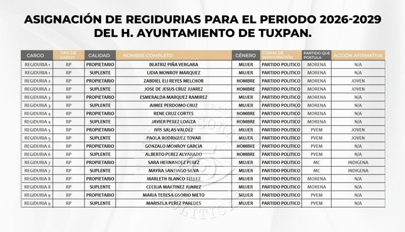 El Organismo Público Local Electoral (OPLE) de Veracruz determinó la asignación de las regidurías que integrarán el Cabildo del Ayuntamiento de Tuxpan para el periodo 2026–2029, conformado por representantes de los partidos Morena, Partido Verde Ecologista de México (PVEM) y Movimiento Ciudadano (MC).