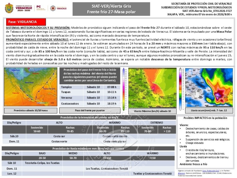 La Secretaría de Protección Civil de Veracruz emitió una Alerta Gris ante la llegada del Frente Frío número 27, que podría provocar lluvias intensas, vientos fuertes y la probabilidad de caída de nieve en zonas altas del estado, principalmente entre la noche del domingo 11 y el lunes 12 de enero. La advertencia aplica para diversas regiones de Veracruz, incluidas las zonas costeras y de montaña, debido al riesgo para la población y la infraestructura.