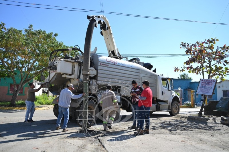 Con apoyo de un camión vactor de Obras Públicas, también se ejecutan trabajos de desazolve en descargas domiciliarias y vialidades, con el propósito de eliminar acumulaciones de aguas residuales que afectaban a diversos puntos del fraccionamiento. Uno de los tramos intervenidos fue el bulevar Olmecas, entre Roca Volcánica y Niño Jaguar, donde hasta el domingo persistía una laguna que impedía el tránsito vehicular y peatonal.