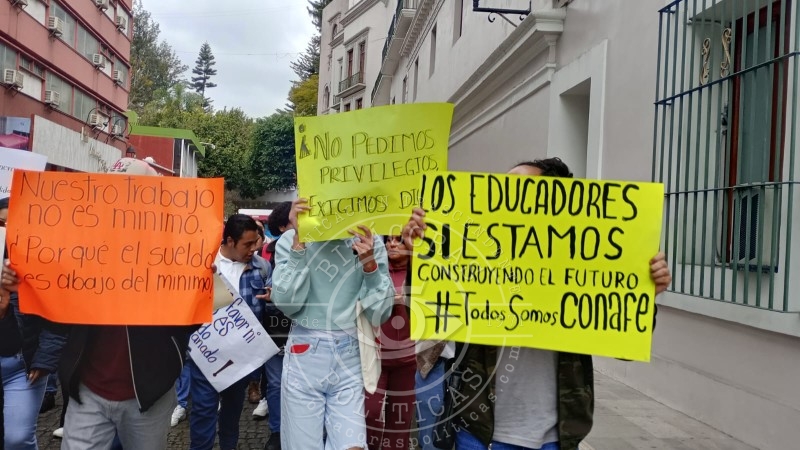 Educadores comunitarios del Consejo Nacional de Fomento Educativo (CONAFE) se manifestaron este lunes en la capital del estado para denunciar presuntas condiciones de explotación laboral, el incumplimiento en el pago de bonos prometidos y la falta de certeza en su relación con la institución, pese a desempeñar funciones educativas en comunidades de alta y muy alta marginación.