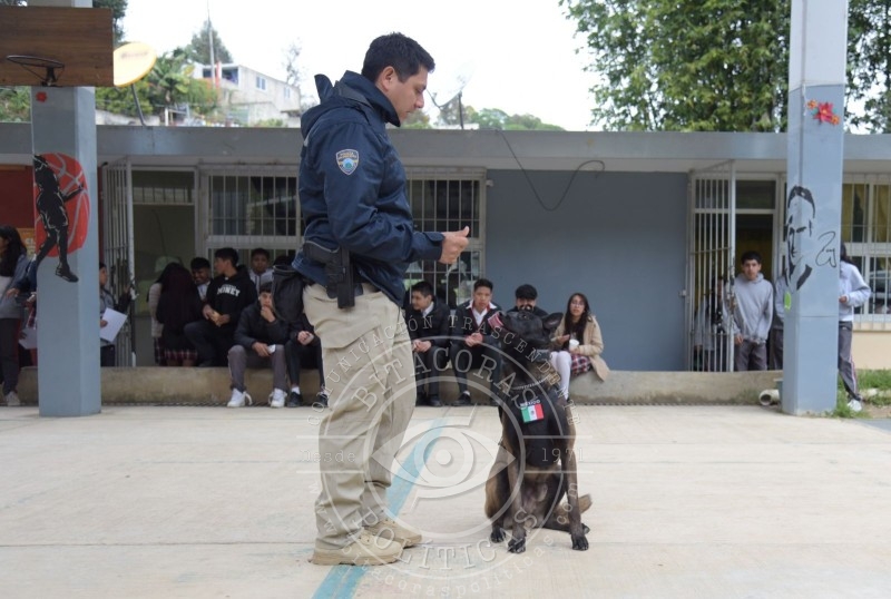 Como parte del programa, se contó con la participación de un elemento canino y un oficial adscrito a la Brigada Animal de la Policía Municipal, quien explicó a las y los estudiantes el manejo, control básico y avanzado del binomio, así como sus habilidades de obediencia, socialización y trabajo en entornos escolares.