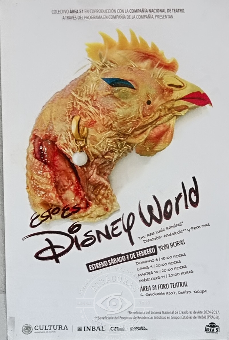 El foro independiente Área 51 Foro Teatral será sede del estreno de Esto es Disney World, una obra que coloca al espectador frente a un retrato crudo de la violencia contemporánea. La temporada arranca este sábado 7 de febrero a las 19:00 horas y se extenderá con funciones durante la semana en el centro de la capital veracruzana.