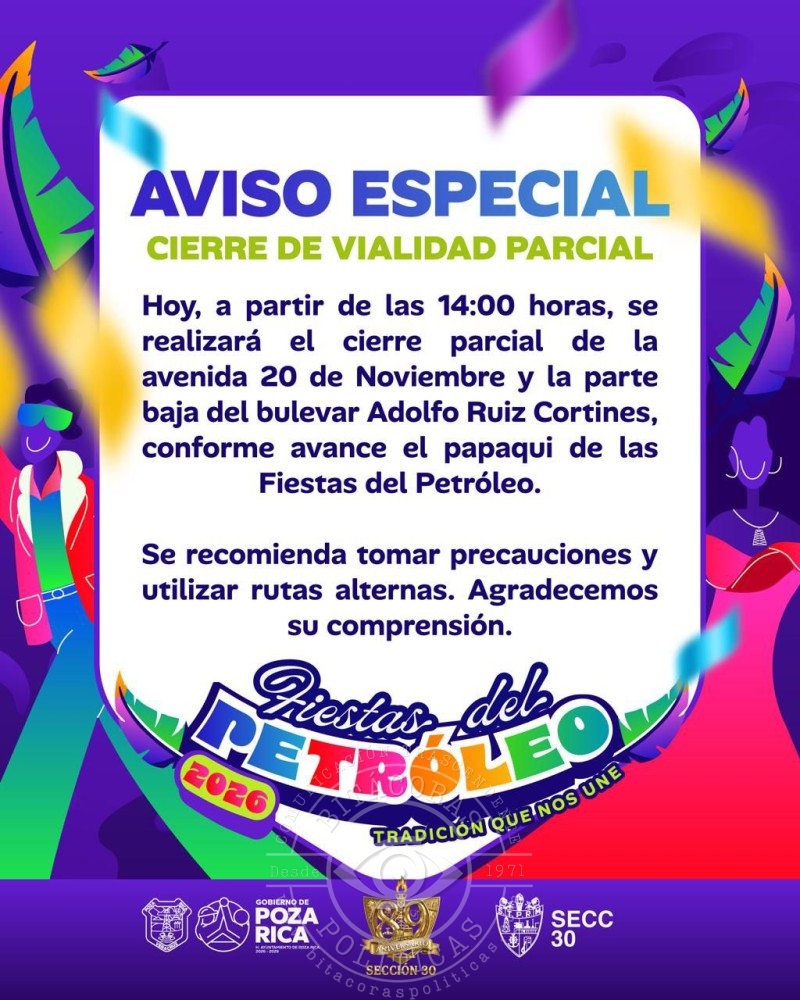 El Ayuntamiento de Poza Rica anunció el cierre parcial de la avenida 20 de Noviembre y de la parte baja del bulevar Adolfo Ruiz Cortines a partir de las 14:00 horas de este viernes, con motivo del papaqui de las Fiestas del Petróleo 2026.