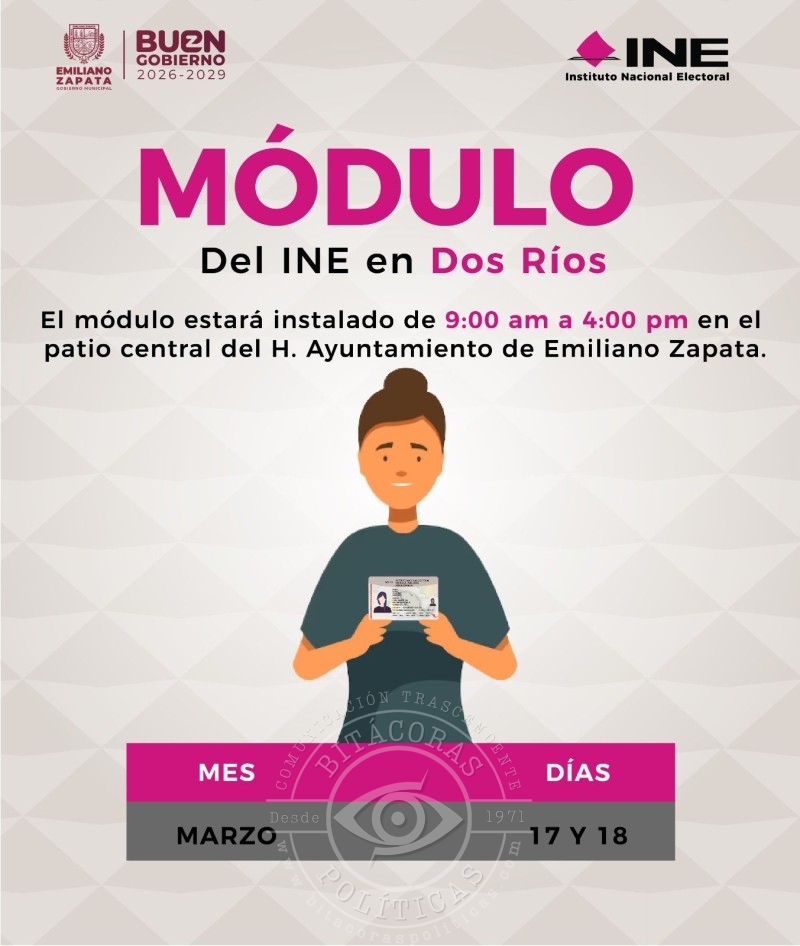 El Instituto Nacional Electoral (INE) instalará un módulo de atención ciudadana en la localidad de Dos Ríos, municipio de Emiliano Zapata, los días 17 y 18 de marzo, con el objetivo de facilitar trámites relacionados con la credencial para votar.