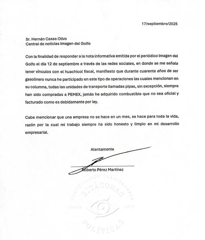 Roberto Pérez Martínez solicitó ejercer su derecho de réplica tras una publicación que lo señaló de presuntos nexos con huachicol fiscal; afirma que su empresa opera bajo legalidad y transparencia.