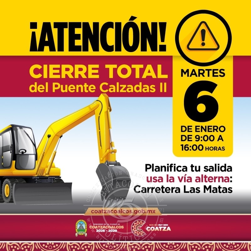 La circulación entre Coatzacoalcos y Minatitlán será suspendida de 9:00 a 16:00 horas por trabajos de alta especialidad; autoridades recomiendan rutas alternas.