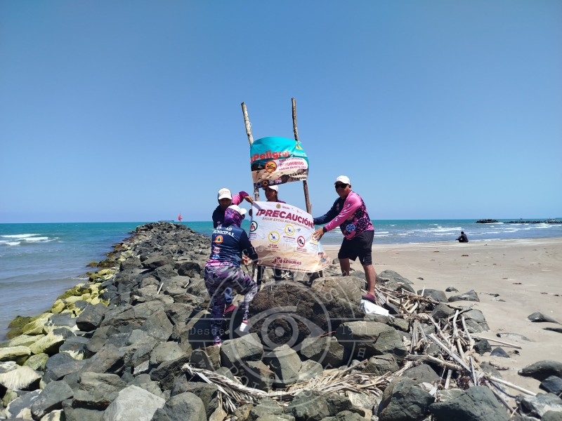 Personal de Protección Civil y de la SSP Municipal colocaron una gran cantidad de avisos preventivos, en diversos puntos de la playa considerados como de riesgo para los turistas.