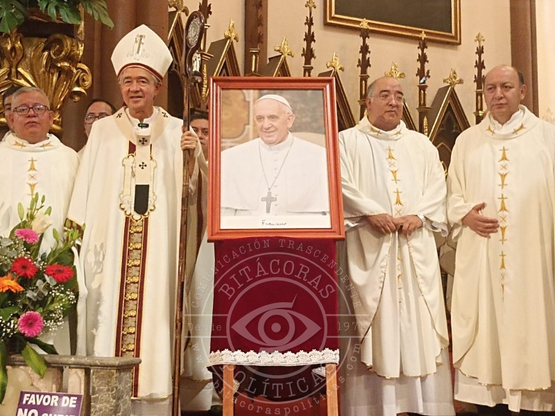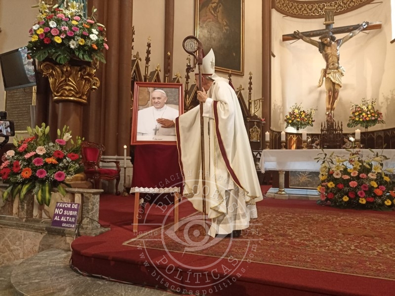 En el altar fue colocado un cuadro con la imagen del Papa y antes de iniciar la homilía, se tocaron cien campanadas, para luego de oficiar la misa hacer una apología de la figura del Santo Padre, de quien recordó que las tres ocasiones que tuvo la oportunidad de ir a Roma “siempre llevaba al Papa una maleta llena de café veracruzano de todas las marcas.