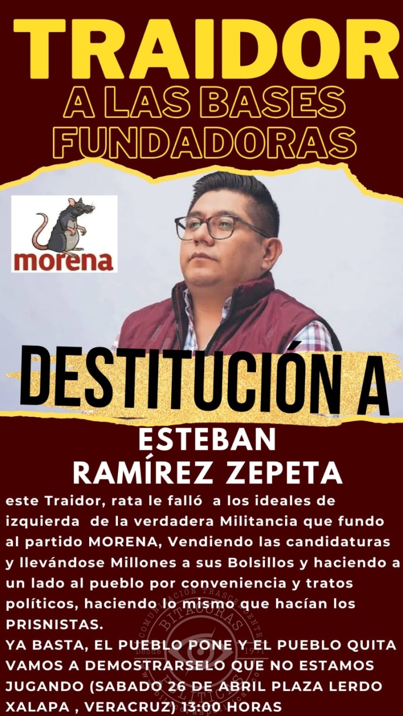 El Movimiento del Frente Nacional Obradorista demandó la destitución de Esteban Ramírez Zepeta, presidente del Comité Directivo Estatal del Partido Movimiento de Regeneración Nacional (Morena) por traicionar los ideales de este instituto político, al imponer como candidatos a las presidencias municipales, sindicaturas y regidurías a gente que no representan ni la lucha, causas, convicciones e ideales del partido guinda.