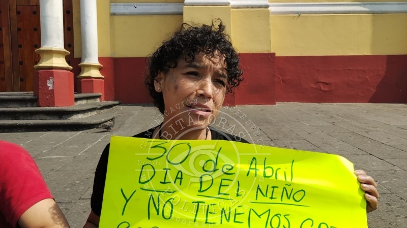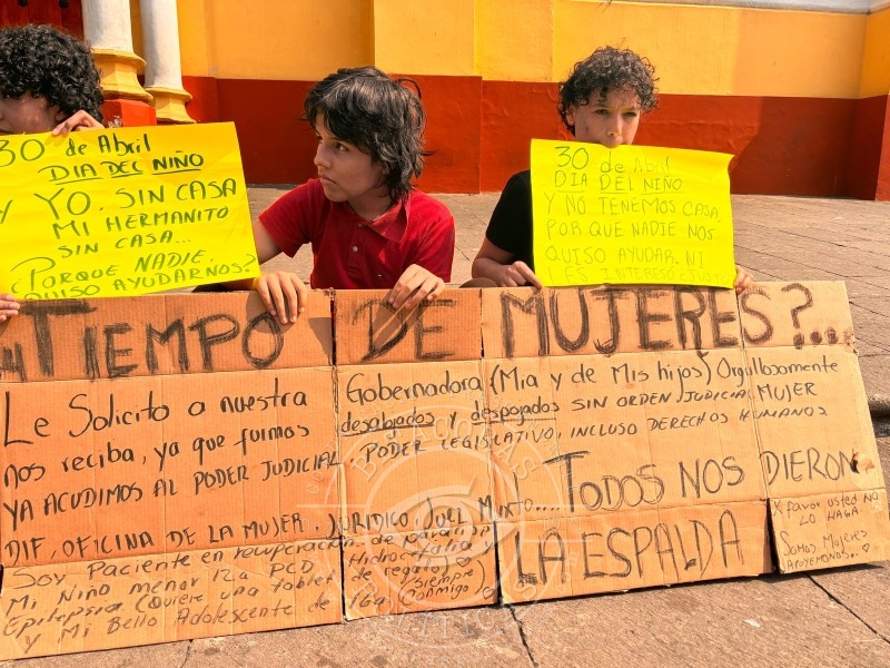 La señora Nadia Citlalli Soto Villareal, acompañada de sus dos hijos menores de edad, uno de ellos con discapacidad intelectual, hidrocefalia y epilepsia, se manifestó en las escalinatas de la Catedral Metropolitana, frente a palacio de gobierno, para solicitar a la gobernadora Rocío Nahle su apoyo para conseguir una vivienda, pues carece de una luego de ser desalojada del espacio donde habitaba.