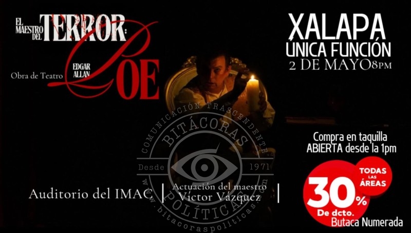 La noche de este viernes, el Auditorio del IMAC será escenario de la única función en Xalapa de El maestro del terror: Edgar Allan Poe, una obra teatral basada en los clásicos relatos del escritor estadounidense. La función, que comenzará a las 20:00 horas, será protagonizada por el actor Víctor Vázquez, quien encarna al propio Poe en una puesta en escena que mezcla narración, actuación y ambientación lúgubre. La obra forma parte de la gira nacional 2025 de Víctor Vázquez Producciones.