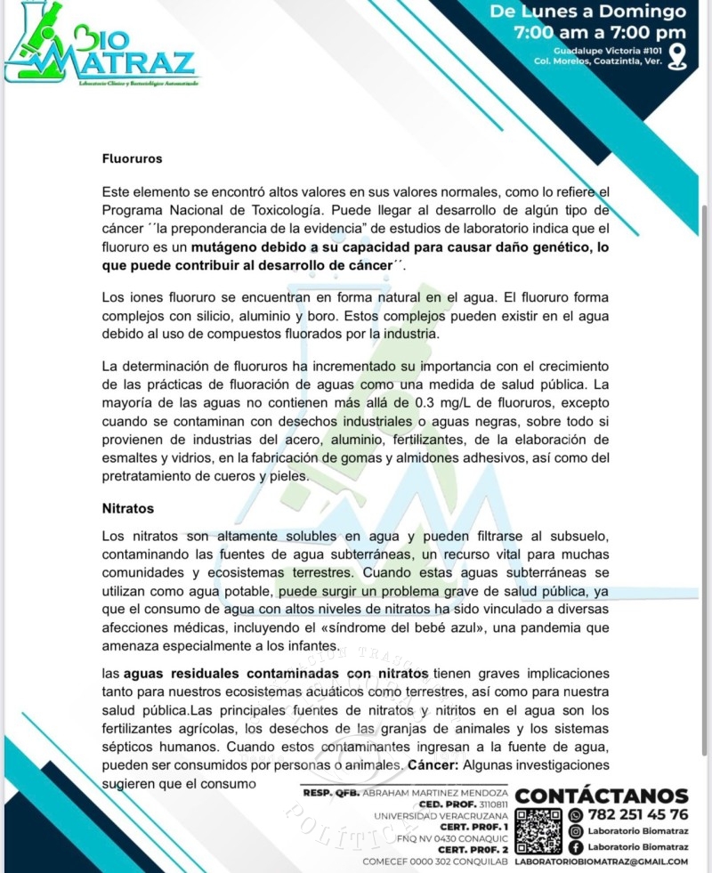 Ubicada detrás de una gasolinera de la misma empresa, y junto a una tienda de conveniencia Hi Bye, la granja ha descargado sistemáticamente residuos crudos al afluente. El laboratorio confirmó la presencia de coliformes fecales como Escherichia coli y Giardia lamblia, además de nitratos, fluoruros, hierro y aluminio en niveles altamente nocivos. Mientras Alanís promete bienestar y progreso en campaña, el agua contaminada ha traído consigo enfermedades intestinales, respiratorias y casos de cáncer en zonas aledañas como el fraccionamiento Olmecas.