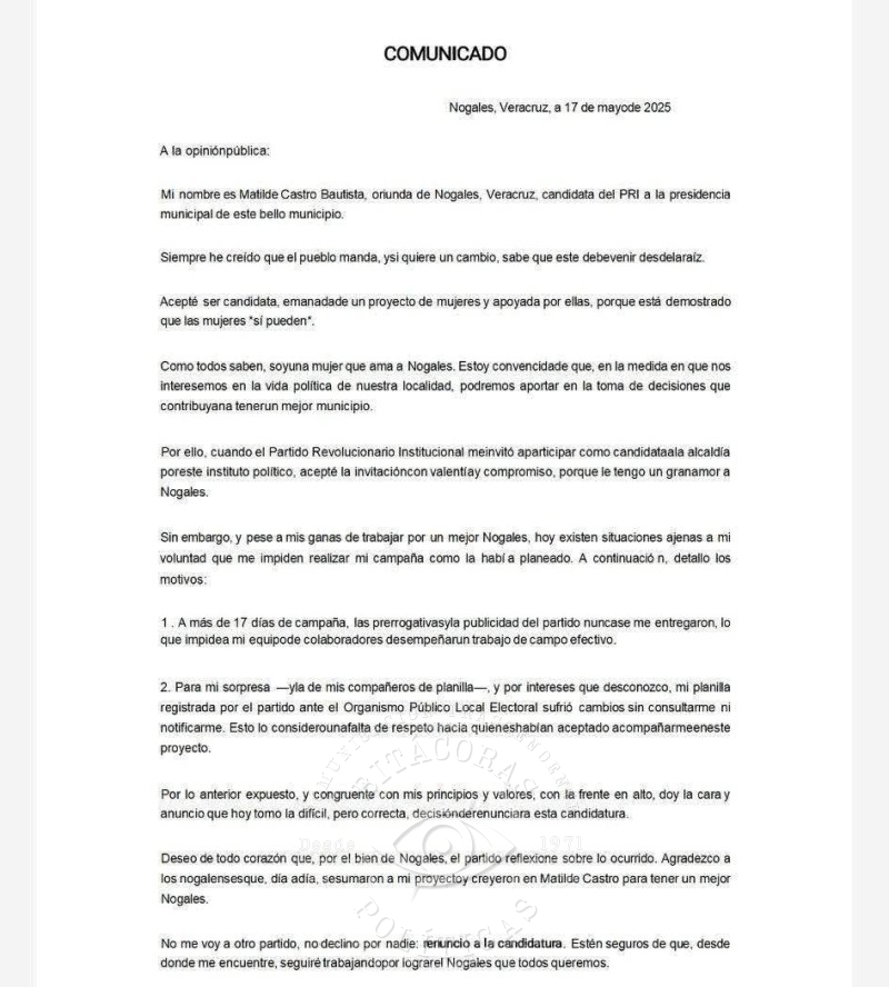 Este sábado, Matilde Castro Bautista, candidata del PRI a la alcaldía de Nogales, Veracruz, presentó su renuncia irrevocable a la candidatura luego de 17 días de campaña sin recibir prerrogativas, materiales de difusión ni respaldo institucional. La exaspirante denunció además que el comité estatal del partido modificó la integración de su planilla sin consultarla, situación que calificó como una falta de respeto hacia su equipo y su proyecto.