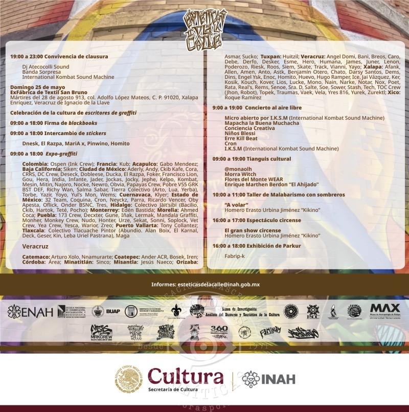 La agenda contempla talleres, exposiciones, cine, música, conferencias, encuentros performáticos y ferias culturales en espacios como el Museo de Antropología de Xalapa, el Instituto de Antropología de la Universidad Veracruzana y la ExFábrica de San Bruno. El evento busca reunir voces que analicen el poder simbólico de las estéticas callejeras desde una perspectiva transdisciplinaria y popular, en diálogo con experiencias comunitarias y académicas.