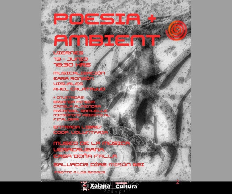 A las 18:30 horas, en el Museo de la Música Veracruzana, se tendrá el proyecto “Poesía + Ambiente”, con musicalización de Eara Ronzón y los visuales de Axel Calatayud. A las 19:00 horas, en el CRX se inaugurará la exposición pictórica “Ecos de una ciudad desnuda”.