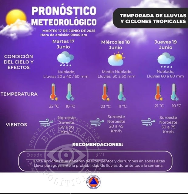 Asimismo, se debe estar pendiente de posibles inundaciones pluviales y fluviales en centros urbanos y rurales; deslizamientos de tierra, deslaves y derrumbes por la saturación del suelo.