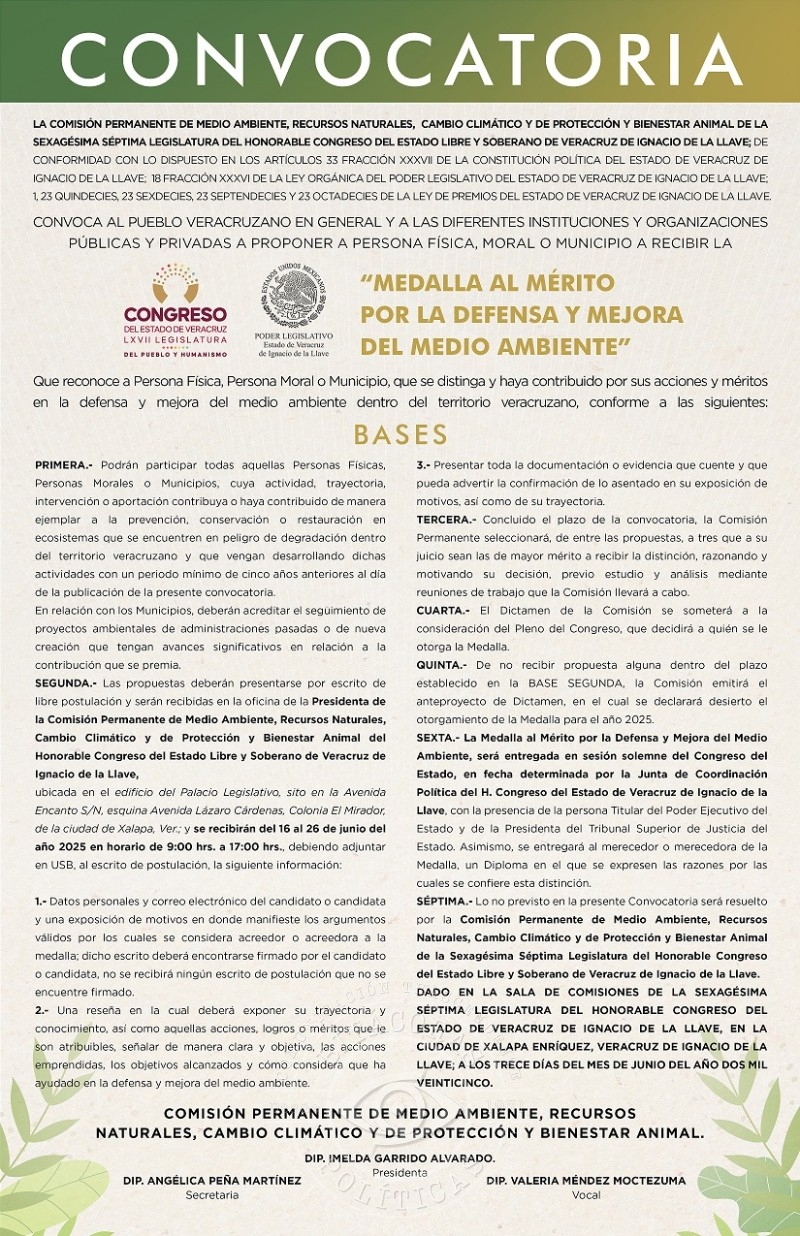 La Comisión Permanente de Medio Ambiente, Recursos Naturales, Cambio Climático y de Protección y Bienestar Animal del Congreso del Estado de Veracruz emitió la convocatoria para otorgar la medalla al Mérito por la Defensa y Mejora del Medio Ambiente 2025. El reconocimiento se entregará en Sesión Solemne del Poder Legislativo a quienes hayan realizado aportaciones ejemplares en favor del entorno natural.