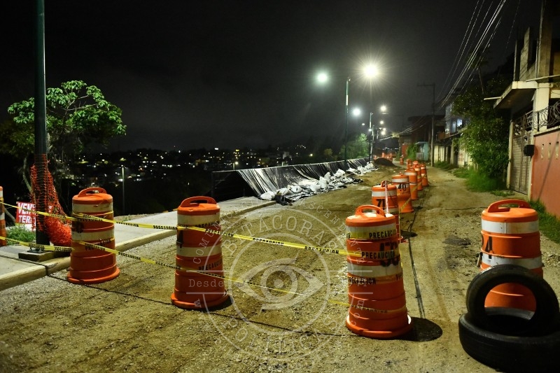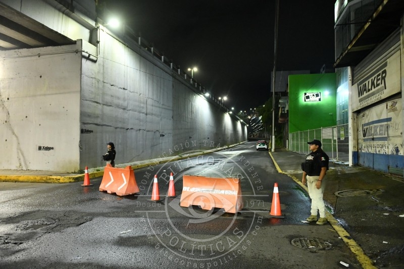 Por seguridad de los vecinos y personas que transitan por la zona, a partir de esta noche personal de la Dirección de Obras Públicas limitó con barreras de concreto recuperado el tránsito vehicular en la calle Prolongación Ruiz Cortines y la lateral del puente Macuiltépetl, donde el exceso de lluvias causó daños parciales a un muro de contención.