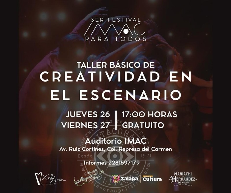 El jueves, en el auditorio de la IMAC, a las 17:00 horas, se impartirá el Taller básico de creatividad en el escenario, como parte del Festival IMAC, el cual se repetirá el viernes a la misma hora, y en el Barrio Mágico de Xallitic, como parte del programa “Tardes de Xallitic”, se presentará Armando Platas, “El brillo de la Cumbia”.