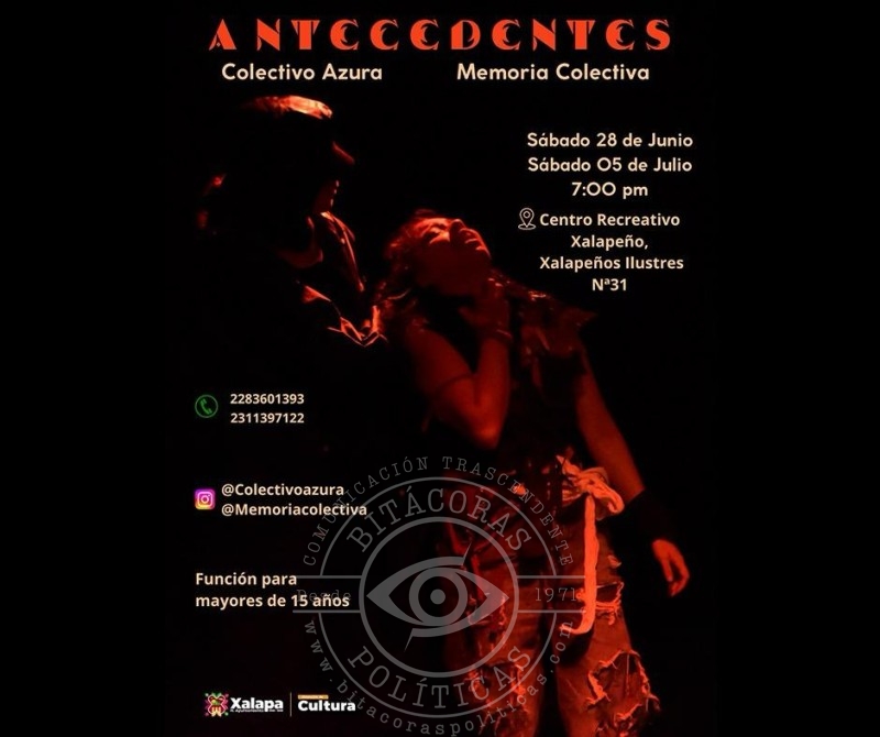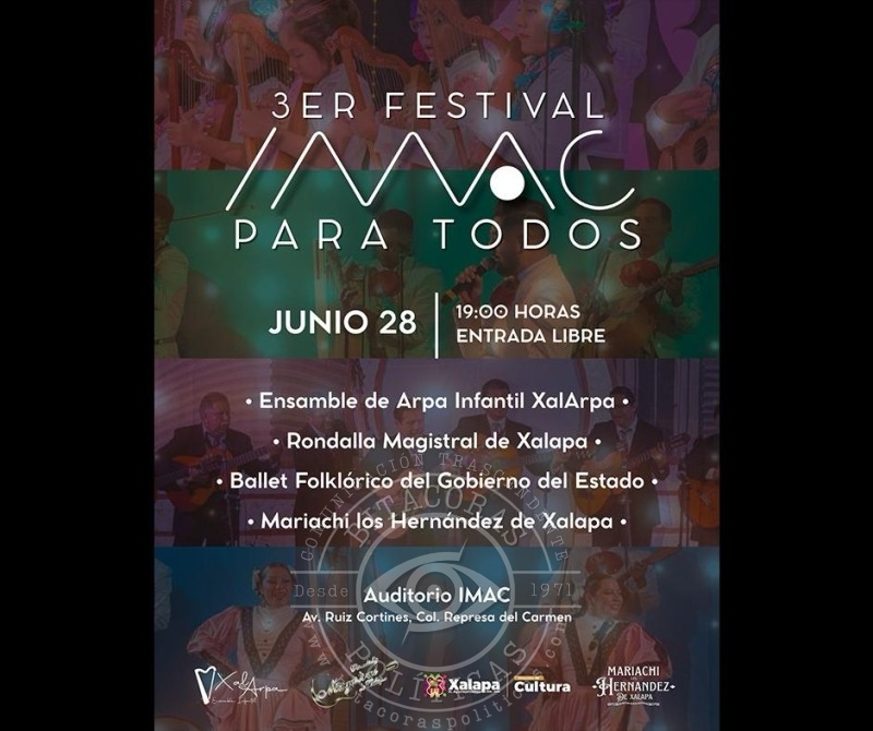 A las 19:00 horas se clausurará el Tercer Festival “IMAC para todos” con el Ensamble Infantil XalArpa, la Rondalla Magistral de Xalapa, el Ballet Folklórico del Gobierno del Estado y el Mariachi Los Hernández de Xalapa, en el auditorio de la IMAC; además, en el CRX se presentará la obra “Antecedentes”, del Colectivo, Azura, Memoria Colectiva, obra para mayores de 15 años.