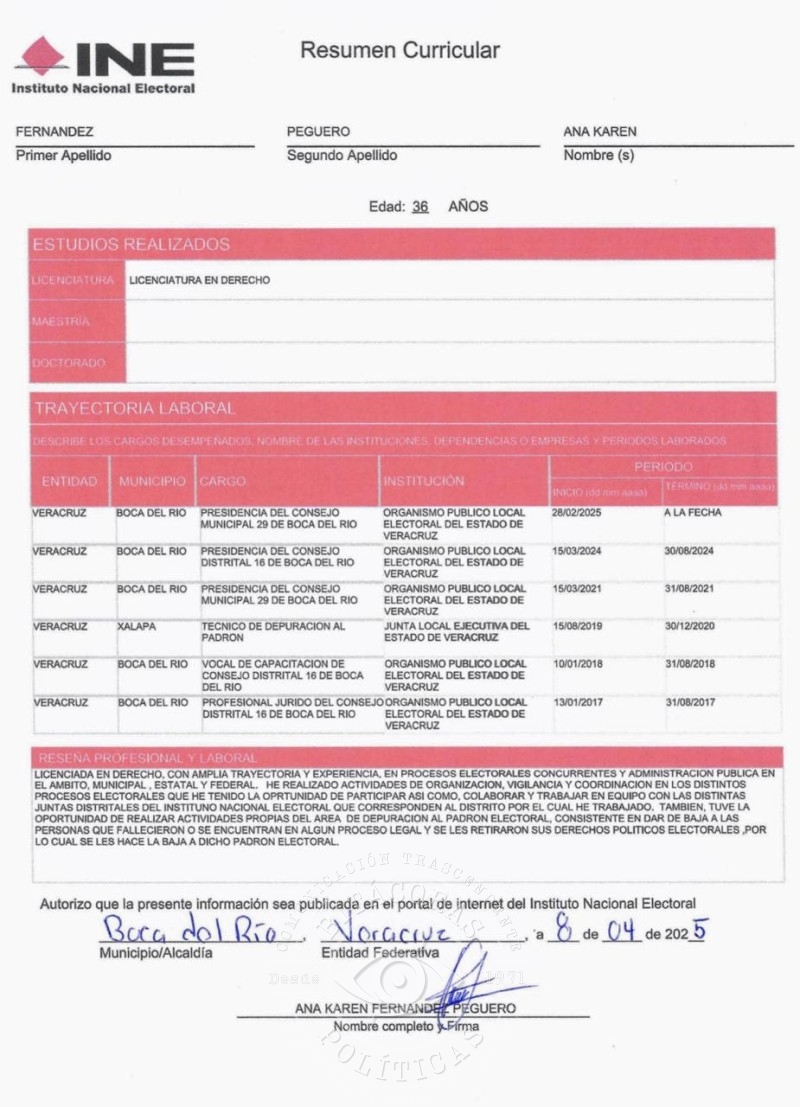 Ana Karen Fernández Peguero, actual presidenta del Consejo Municipal #29 del Organismo Público Local Electoral (OPLE) en Boca del Río, es señalada por un presunto conflicto de interés, luego de que documentos oficiales revelaran que recibió un salario superior a los 100 mil pesos mensuales en el ayuntamiento panista de esta ciudad durante los años 2022 y 2023, bajo la administración del alcalde Juan Manuel Unanue.