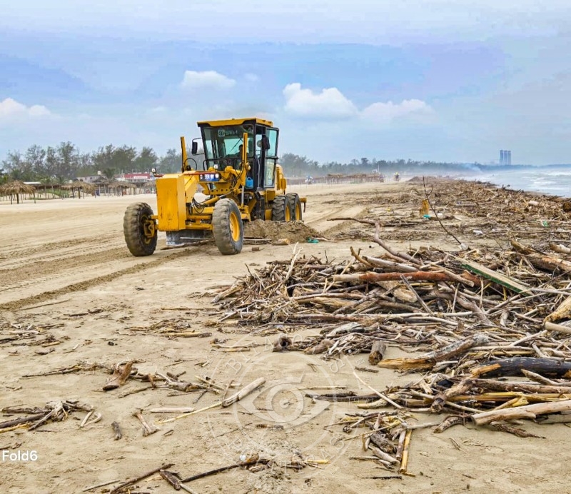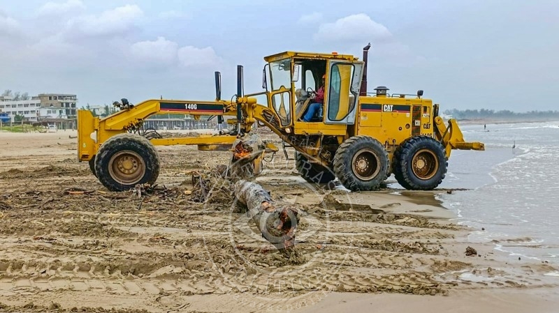 Personal y maquinaria de Obras Públicas del Ayuntamiento trabajan en el retiro de palizada y limpieza general de la Playa Barra Norte. En este primer día el cambio es más que evidente.