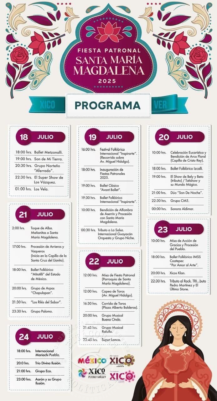 La Fiesta Patronal, que se celebra del 18 al 24 de julio, contempla también misas, procesiones, conciertos, encuentros culturales y eventos religiosos en honor a Santa María Magdalena. Como parte de la programación oficial, el día 22 se celebrará a las 12:00 del día la Misa de Fiesta Patronal en la parroquia principal, mientras que a las 16:30 horas tendrá lugar la corrida de toros en la Plaza Alberto Balderas.