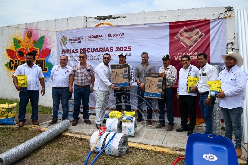 Productores pecuarios de Tuxpan y municipios aledaños fueron beneficiados con la entrega gratuita de 330 paquetes de insumos, equipamiento y módulos avícolas durante la Feria Pecuaria 2025, organizada por la Secretaría de Desarrollo Agropecuario, Rural y Pesca (SEDARPA) en coordinación con autoridades estatales y municipales.