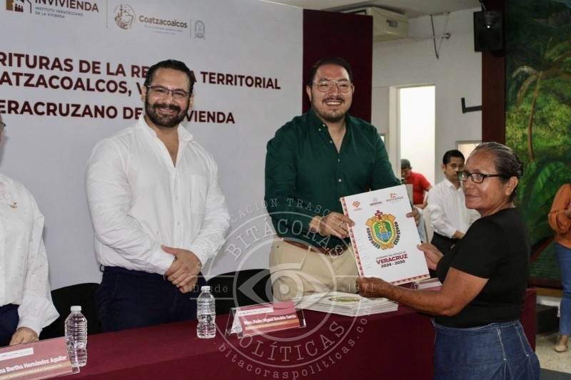 Pedro Miguel Rosaldo García, presidente municipal electo de Coatzacoalcos, participó este jueves en la entrega de 34 escrituras a habitantes del municipio, como parte de una estrategia conjunta con el Instituto Veracruzano de la Vivienda (INVIVIENDA) para avanzar en la regularización del patrimonio familiar. El acto fue encabezado por el gerente general del organismo estatal y marca el inicio de una política de bienestar centrada en la certeza jurídica sobre la tenencia de la tierra.