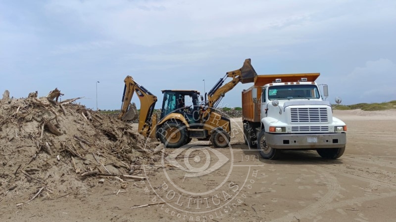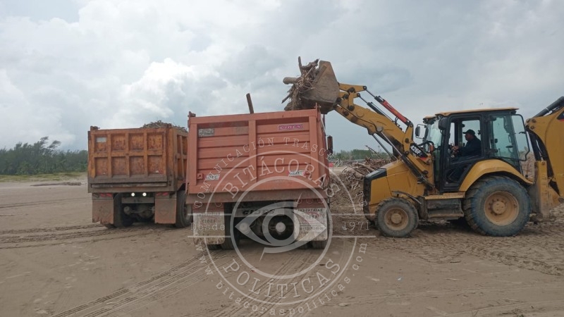 Personal de la Dirección de Obras Públicas del municipio de Tuxpan inició este lunes el retiro de palizada acumulada en varios puntos del litoral, como parte de las labores de limpieza tras las lluvias recientes. Los trabajos se realizan con el apoyo de camiones y maquinaria especializada.