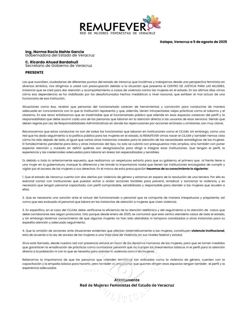 La Red de Mujeres Feministas del Estado de Veracruz (REMUFEVER) exhortó formalmente al Gobierno del Estado a tomar medidas urgentes ante los señalamientos de violencia institucional y maltrato dentro del Centro de Justicia para las Mujeres (CEJUM). En un oficio dirigido a la gobernadora Rocío Nahle García y al secretario de Gobierno, Ricardo Ahued Bardahuil, la organización denunció que las fallas en la atención a mujeres víctimas de violencia no son casos aislados, sino parte de un patrón sistemático derivado de la falta de profesionalismo y sensibilidad del personal a cargo.