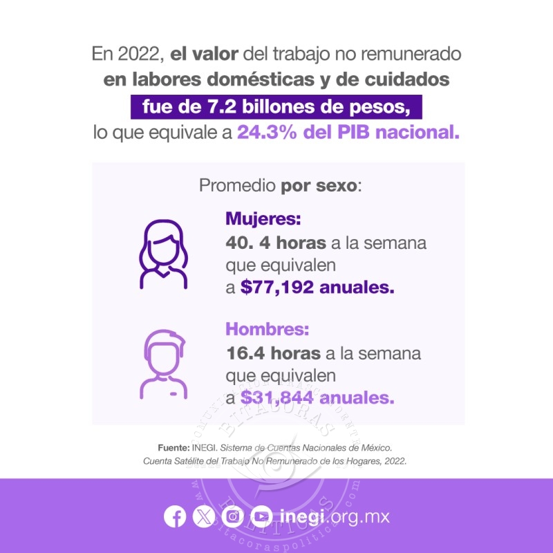 De acuerdo con un ejercicio de ejemplo, una persona que dedica 21 horas semanales al hogar acumula 1,092 horas anuales, lo que equivale a un valor económico de 41 mil 152 pesos. En comparación, el promedio anual del valor del trabajo doméstico realizado por mujeres es de 77 mil 192 pesos, mientras que en los hombres asciende a 31 mil 844 pesos, lo que refleja la brecha de género en la distribución de estas tareas.