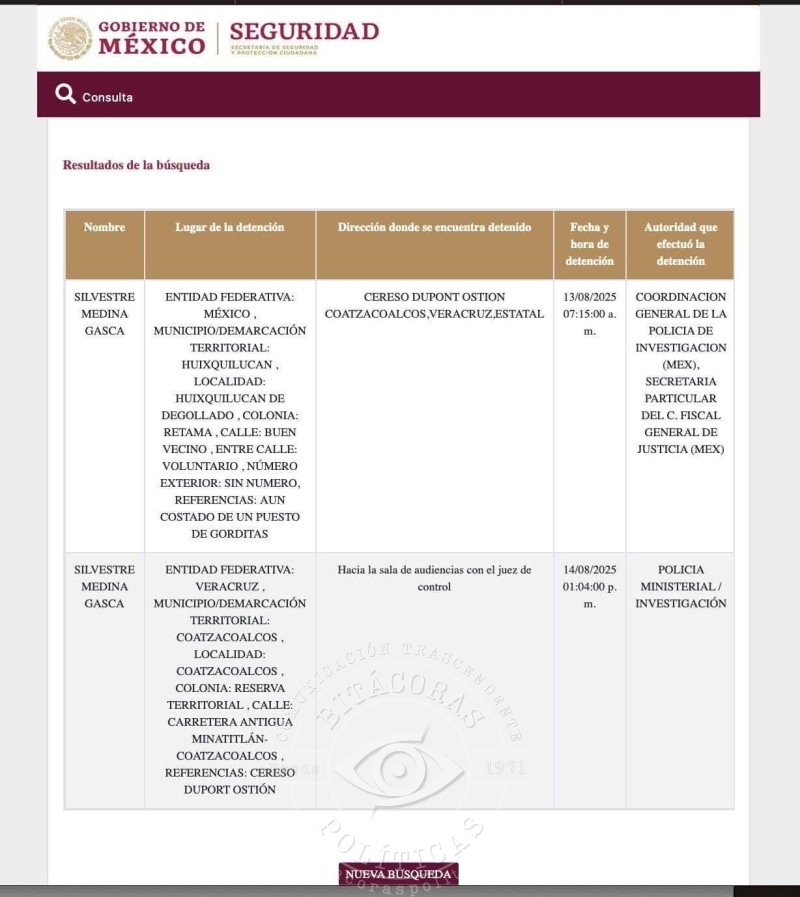 De acuerdo con el Registro Nacional de Detenciones, Medina Gasca fue trasladado un día después al Centro de Reinserción Social Duport Ostión, en Coatzacoalcos, donde permanece bajo estrictas medidas de seguridad y aislado de la población general.