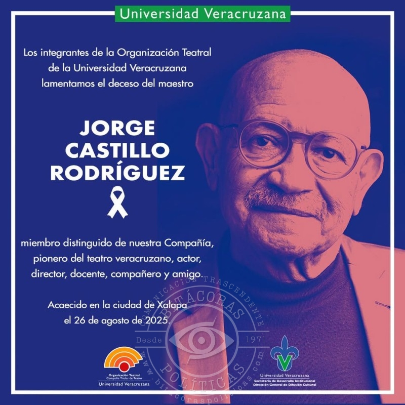 La comunidad cultural y universitaria lamenta el fallecimiento de Jorge Castillo Rodríguez, actor, director, escritor y fotógrafo, miembro de la Compañía Titular de Teatro de la Universidad Veracruzana (ORTEUV) desde 1974 y pionero en la formación de varias generaciones de artistas escénicos. Su deceso fue confirmado por la propia compañía, que expresó sus condolencias a familiares, colegas y amistades.