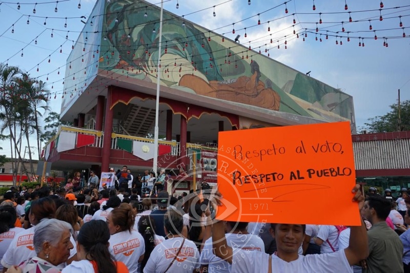 Olvera se dirigió al público frente al Palacio Municipal en un ambiente de tensión, con presencia de elementos de la Secretaría de Seguridad Pública (SSP) equipados con material antimotines en puntos estratégicos de la ciudad. Durante su mensaje, hizo un llamado a la movilización pacífica y a la vigilancia ciudadana del proceso electoral, enfatizando la necesidad de mantener el civismo.