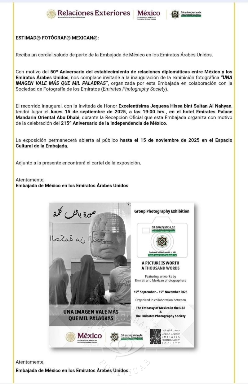 A través de un mensaje público, Castillo expresó su agradecimiento a la Secretaría de Relaciones Exteriores y a la Embajada Mexicana en los Emiratos Árabes Unidos por la invitación, destacando la oportunidad de fortalecer los lazos culturales entre ambas naciones mediante el arte fotográfico.