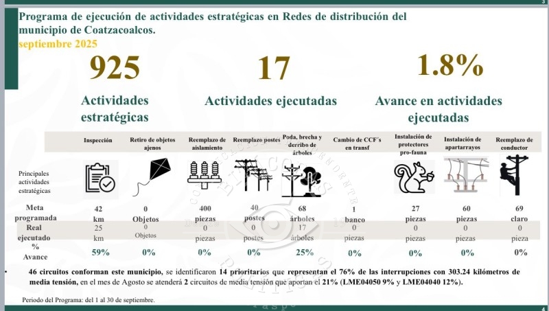 La Comisión Federal de Electricidad (CFE) Distribución, en coordinación con el alcalde electo de Coatzacoalcos, Pedro Miguel Rosaldo García, puso en marcha un plan de actualización de la red eléctrica que inició en agosto y concluirá en diciembre de este año. La estrategia consiste en invertir el orden de mantenimiento: ahora se atenderá primero al centro de la ciudad y después a los ejidos, con el propósito de beneficiar con mayor rapidez a la mayoría de la población.
