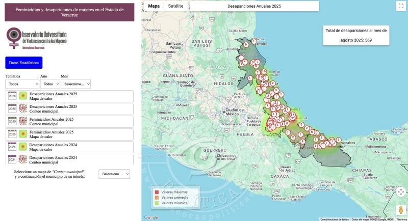 Entre enero y agosto de 2025, en Veracruz se registraron 42 feminicidios, 79 homicidios, 569 desapariciones y 147 agresiones contra mujeres, de acuerdo con datos del Observatorio Universitario de Violencias contra las Mujeres (OUVMujeres) de la Universidad Veracruzana. La información, difundida en su más reciente informe, refleja la persistencia de un escenario de riesgo para las mujeres en la entidad.