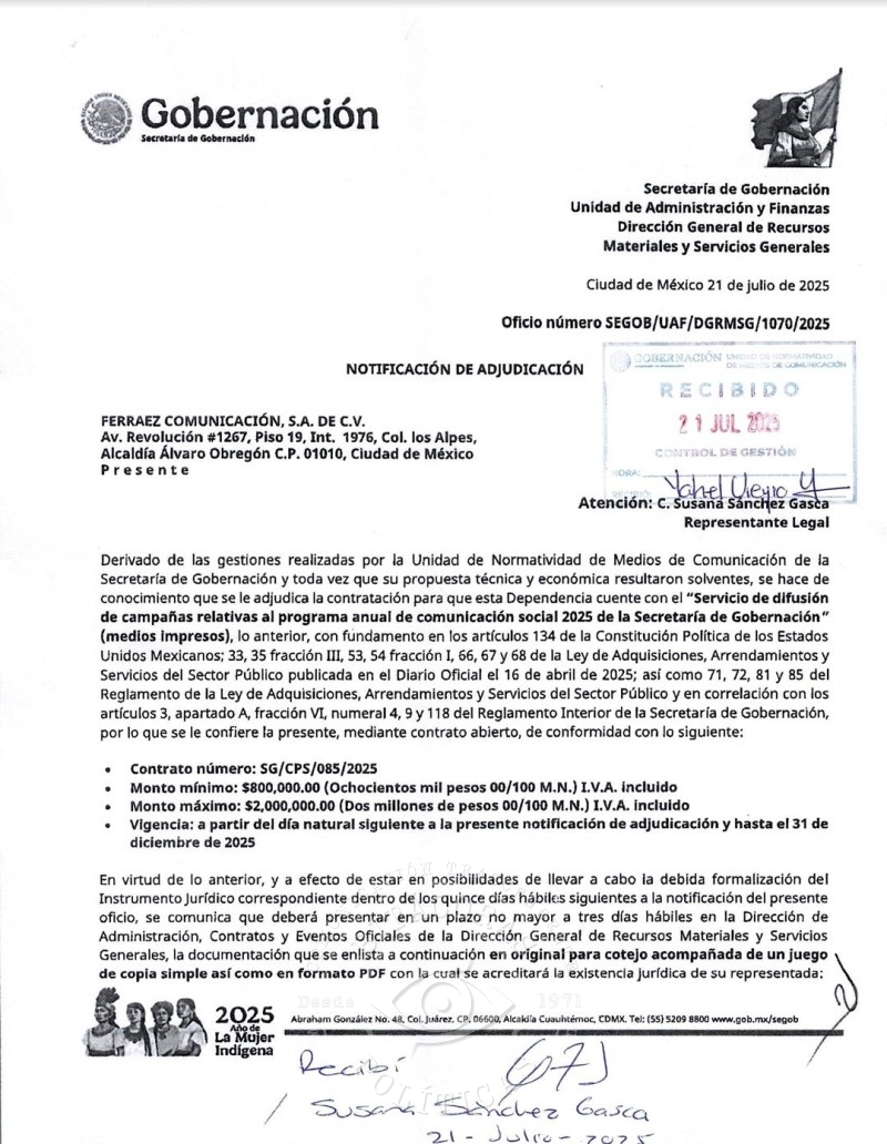 La Secretaría de Gobernación (Segob) adjudicó un contrato a la empresa Ferraez Comunicación, S.A. de C.V., por un monto máximo de 2 millones de pesos para el “Servicio de difusión de campañas relativas al programa anual de comunicación social 2025”, en medios impresos. El oficio de notificación fue emitido por la Dirección General de Recursos Materiales y Servicios Generales de la Unidad de Administración y Finanzas de la dependencia federal.