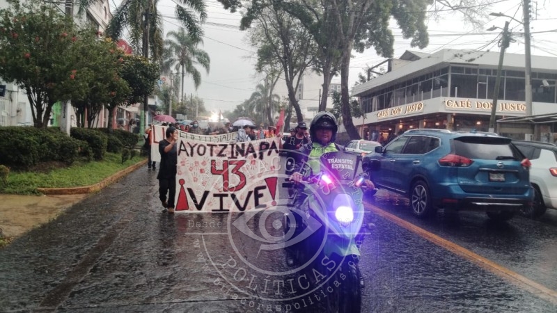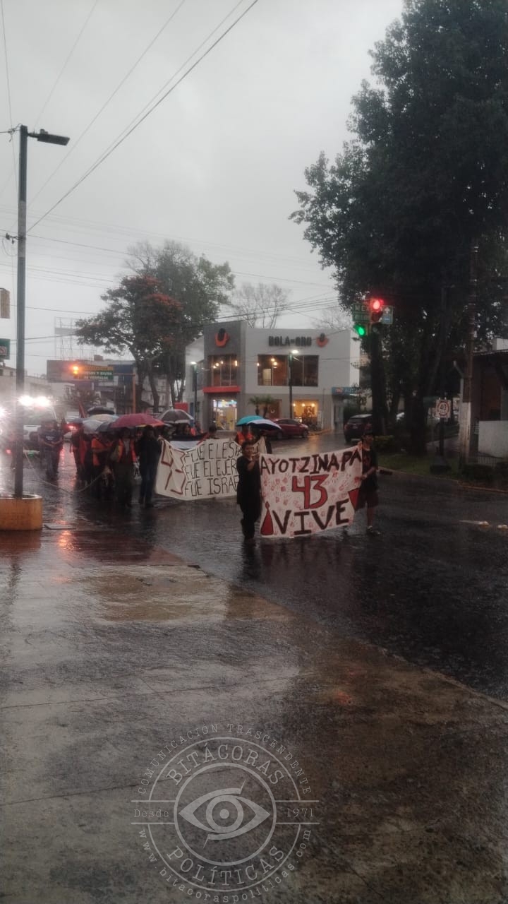 Durante el recorrido, que se llevó a cabo pese a la intensa lluvia, los jóvenes entonaron consignas y pronunciaron los nombres de los 43 desaparecidos como parte de un homenaje colectivo. Al llegar al centro de la ciudad, emitieron un pronunciamiento en el que reiteraron la exigencia de verdad y justicia para las víctimas y sus familias.
