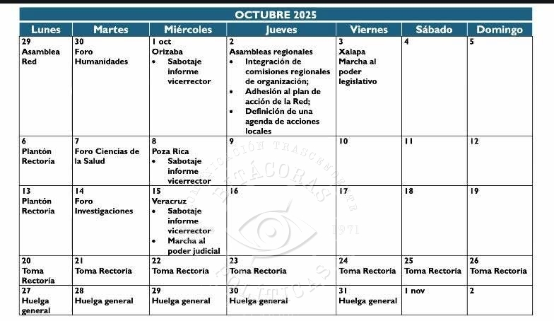 El calendario de acciones contempla manifestaciones en los informes de los vicerrectores de Orizaba (1 de octubre), Poza Rica (8 de octubre) y Veracruz (15 de octubre). En este último caso, los universitarios prevén marchar hacia la sede del Poder Judicial de la Federación en Boca del Río, donde se concentran los juicios de amparo promovidos contra la prórroga del actual rectorado.