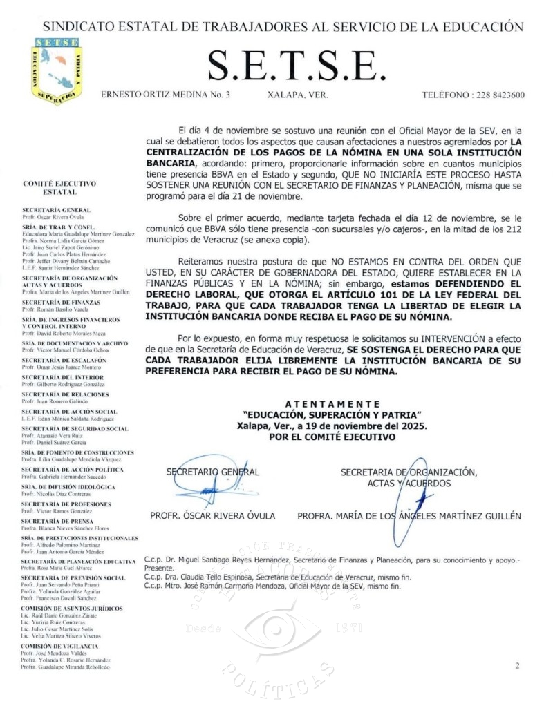 El Sindicato Estatal de Trabajadores al Servicio de la Educación (SETSE) solicitó a la gobernadora de Veracruz, Rocío Nahle García, intervenir para garantizar que las y los trabajadores de la educación conserven el derecho a elegir la institución bancaria donde reciben el pago de su nómina. La petición fue formalizada mediante un oficio fechado el 19 de noviembre de 2025 y dirigido al Ejecutivo estatal, después de que circularon documentos oficiales que, según el magisterio, podrían implicar la centralización del pago salarial en un solo banco.