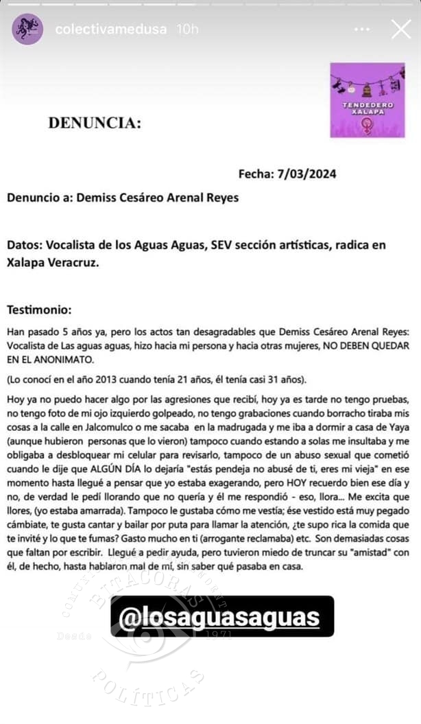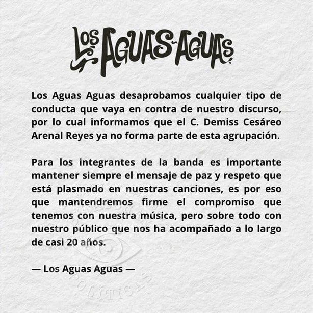 La banda Los Aguas Aguas, fundada en 2005 en Xalapa y reconocida por fusionar reggae, cumbia, son jarocho y jazz, se desintegró luego de que la agrupación anunció públicamente la separación de Arenal el 12 de marzo de 2024. Esto ocurrió tras su aparición en tendederos digitales y presenciales durante las movilizaciones del 8 de marzo, donde fue señalado por violencia física, psicológica y sexual. La propia banda, en ese momento, expresó que “desaprueba cualquier tipo de conducta que vaya en contra de su discurso” y que la salida del vocalista respondía a la necesidad de mantener el mensaje de paz y respeto presente en su obra.