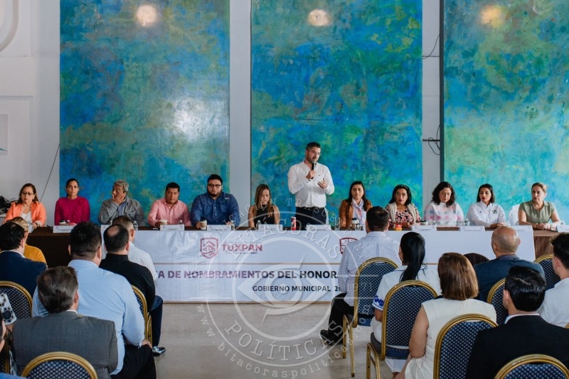 En el presídium estuvieron integrantes del Cabildo: Marta Laura Sárate Vencio, síndica única; Beatriz Piña Vergara, regidora primera; Eliceo Reyes Melchor, regidor segundo; Esmeralda Márquez Ramírez, regidora tercera; René Cruz Cortés, regidor cuarto; Ibis Salas Valdés, regidora quinta; Gonzalo Monroy García, regidor sexto; Sara Hernández Pérez, regidora séptima; Marlen Blanco Téllez, regidora octava; y María Teresa Osorio Nieto, regidora novena. El alcalde subrayó que se trata de un Cabildo integrado por cuatro hombres y siete mujeres, y afirmó que en Tuxpan “también va a ser tiempo de mujeres”, con el compromiso de dar resultados.
