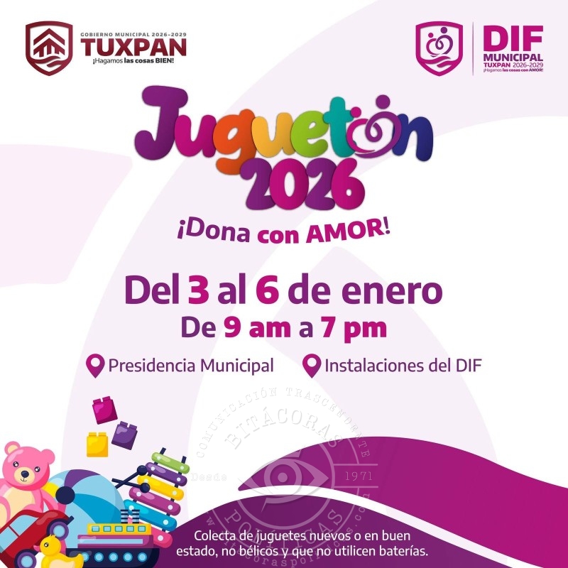 El DIF Tuxpan inició la convocatoria al “Juguetón 2026, ¡Dona con Amor!”, una campaña solidaria para recolectar juguetes y llevar alegría a niñas y niños del municipio con motivo del Día de Reyes. La iniciativa fue anunciada este 2 de enero de 2026 en Tuxpan, con el llamado a la participación de la ciudadanía y el sector privado.