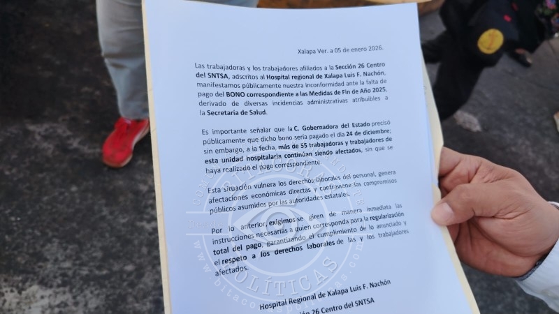 Ante esta situación, el personal solicitó a las autoridades correspondientes una aclaración inmediata sobre el motivo del retraso y la garantía de que los pagos pendientes —incluido el bono de Día de Reyes— se cubrirán a la brevedad, en apego a los compromisos laborales y a los derechos de las y los trabajadores del sector salud en Xalapa.